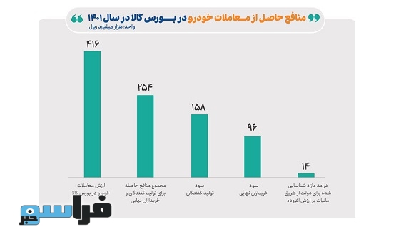 بازخوانی تجربه عرضه خودرو در بورس کالا طی سال ۱۴۰۱ بیانگر آن است که از مجموع ارزش معاملات خودرو که به ۴۱.۶ همت رسید، منافع حاصله برای تولیدکنندگان و خریداران نهایی ۲۵.۴ همت، شامل ۱۵.۸ همت سود تولیدکنندگان و ۹.۶ همت سود خریداران نهایی بود؛ همچنین درآمد مازاد شناسایی شده برای دولت از طریق مالیات بر ارزش افزوده ۱.۴ همت بوده است.