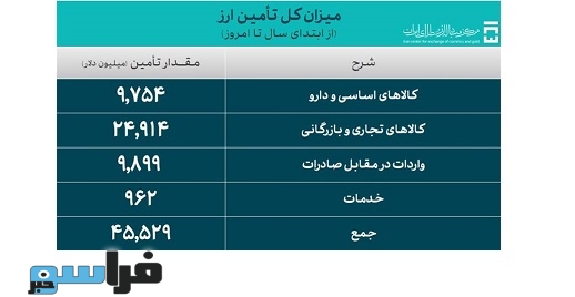 بانک مرکزی از اول فروردین ماه تا ۳۰ آبان ماه امسال، ۴۵ میلیارد و ۵۲۹ میلیون دلار ارز برای واردات کالاهای اساسی، دارو، کالاهای تجاری و بازرگانی، واردات در مقابل صادرات و خدمات تأمین کرده است.