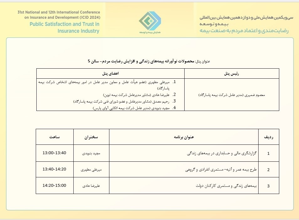 انتشار عناوین سخنرانیهای علمی پنل تخصصی “محصولات نوآورانه بیمههای زندگی و افزایش رضایت مردم” در همایش بیمه و توسعه