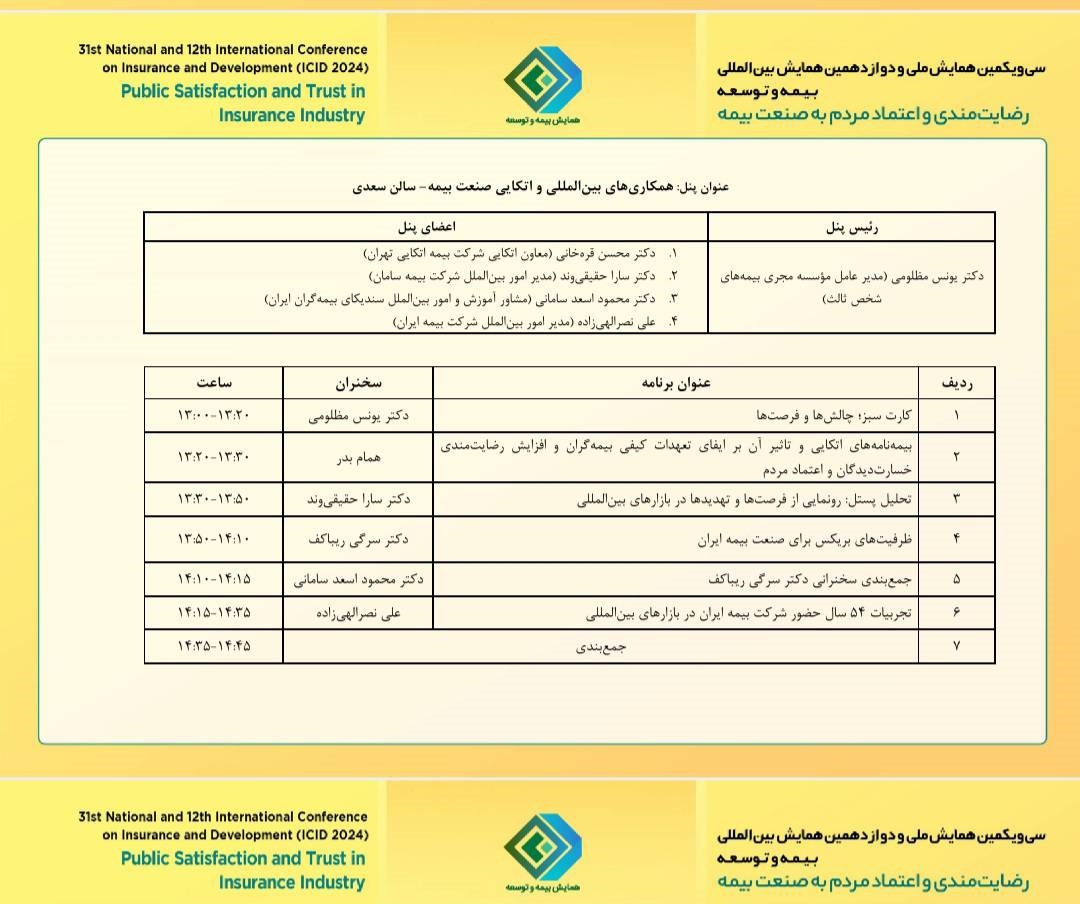 در این پنل تخصصی، سخنرانی علمی با موضوع «کارت سبز؛ چالشها و فرصتها» توسط دکتر یونس مظلومی، «بیمهنامههای اتکایی و تاثیر آن بر ایفای تعهدات کیفی بیمهگران و افزایش رضایتمندی خسارتدیدگان و اعتماد مردم» توسط همام بدر، «تحلیل پستل: رونمایی از فرصتها و تهدیدها در بازارهای بینالمللی» توسط دکتر سارا حقیقیوند، «ظرفیتهای بریکس برای صنعت بیمه ایران» توسط دکتر سرگی ریباکف و سخنرانی علمی با موضوع «تجربیات ۵۴ سال حضور شرکت بیمه ایران در بازارهای بینالمللی» توسط علی نصرالهیزاده ارائه خواهد شد.