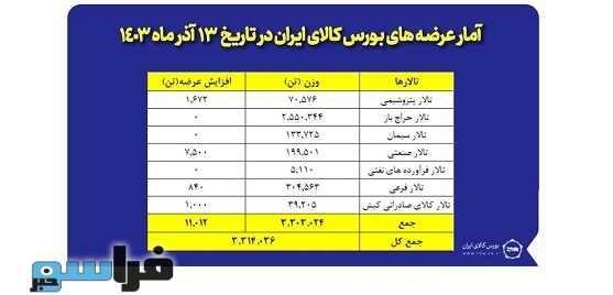 تالارهای بورس کالای ایران در روز سهشنبه ۱۳ آذرماه میزبان عرضه ۳ میلیون و ۳۱۴ هزار و ۳۶ تن انواع کالا و محصول است.