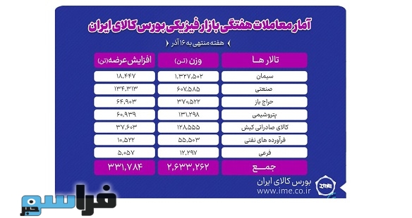 در معاملات هفته گذشته بازار فیزیکی بورس کالای ایران ۲ میلیون و ۶۳۳ هزار و ۲۶۲ تن انواع محصول به ارزش ۳۳ هزار میلیارد تومان دادوستد شد.