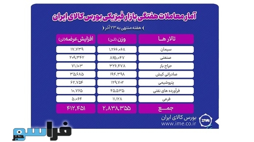 به گزارش فراسو، در هفته گذشته تالار محصولات صنعتی و معدنی شاهد معامله ۲ میلیون ۳۹۱ هزار و ۹۵۵ تن محصول به ارزش ۲۷ هزار میلیارد تومان بود.