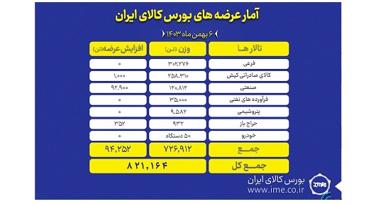 تالارهای بورس کالای ایران در نخستین روز هفته (شنبه ۶ بهمنماه) میزبان عرضه ۸۲۱ هزار و ۱۶۴ تن انواع کالا و محصول است.