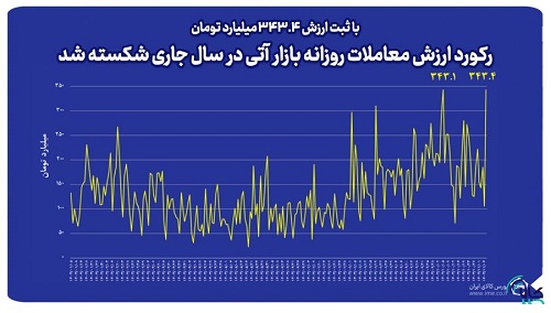 رکورد ارزش معاملات روزانه قراردادهای آتی بورس کالای ایران در سال جاری، دیروز ۶ بهمن ماه با عبور ارزش معاملات از ۳۴۳.۴ میلیارد تومان شکسته شد؛ آخرین رکورد شکنی ارزش معاملات روزانه بازار آتی متعلق به ۵ دی ماه و با ثبت ارزش ۳۴۳.۱ میلیارد تومان بود.