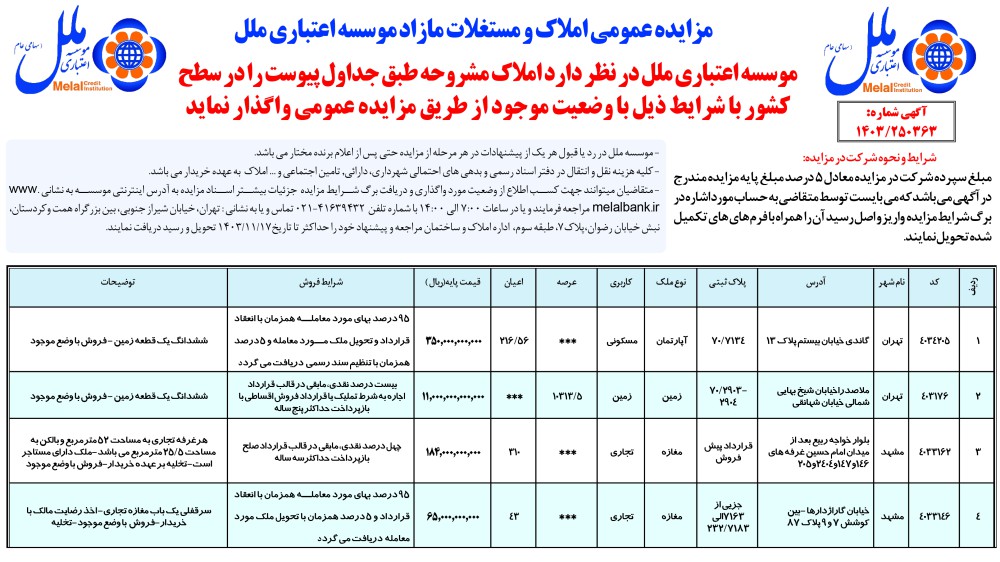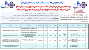 موسسه اعتباری ملل قصد دارد با برگزاری مزایده عمومی تعدادی از املاک و مستغلات مازاد متعلق به خود را در سطح کشور واگذار نماید. به گزارش فراسو، متن کامل این مزایده به شرح زیر است: