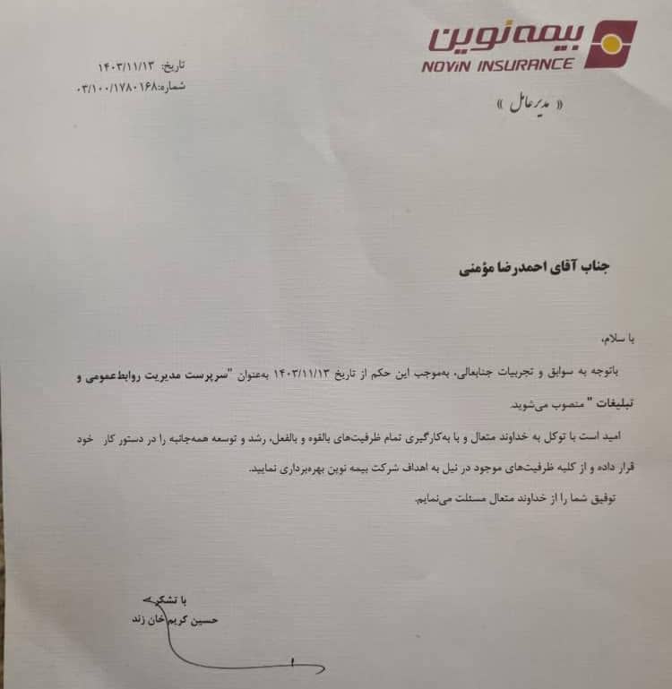حسین کریم خان زند مدیرعامل بیمه نوین در حکمی احمدرضا مومنی را به سمت سرپرست مدیریت روابط عمومی و تبلیغات این شرکت منصوب کرد. به گزارش فراسو، متن حکم انتصاب احمدرضا مومنی بدین شرح است: