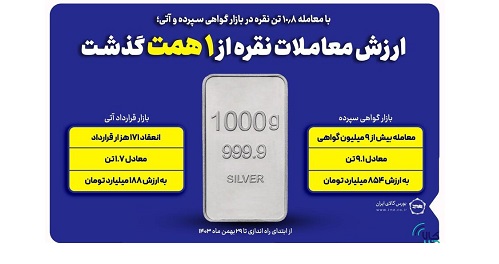 معاملات گواهی سپرده و آتی نقره در بورس کالای ایران که از همان ابتدای راه اندازی با استقبال بالای سرمایه گذاران مواجه شد، رکوردشکنی جدیدی را به ثبت رسانده است به طوریکه با معامله ۱۰.۸ تن نقره از ابتدای راه اندازی تاکنون، ارزش معاملات این فلز ارزشمند از یک همت فراتر رفت.
