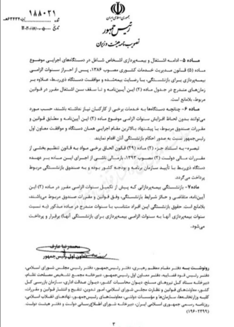 بر اساس این قانون، ادامه اشتغال و بیمهپردازی اشخاص شاغل در دستگاههای اجرایی موضوع ماده (۵) قانون مدیریت خدمات کشوری مصوب ۱۳۸۶ پس از احراز سنوات الزامی بیمه پردازی برای بازنشستگی با رضایت بیمه شده و موافقت دستگاه ذیربط، علاوه بر زمانهای مندرج در جدول ماده (۲) این آیین نامه و تا سقف سن اشتغال مقرر در قوانین مربوط بلامانع است.