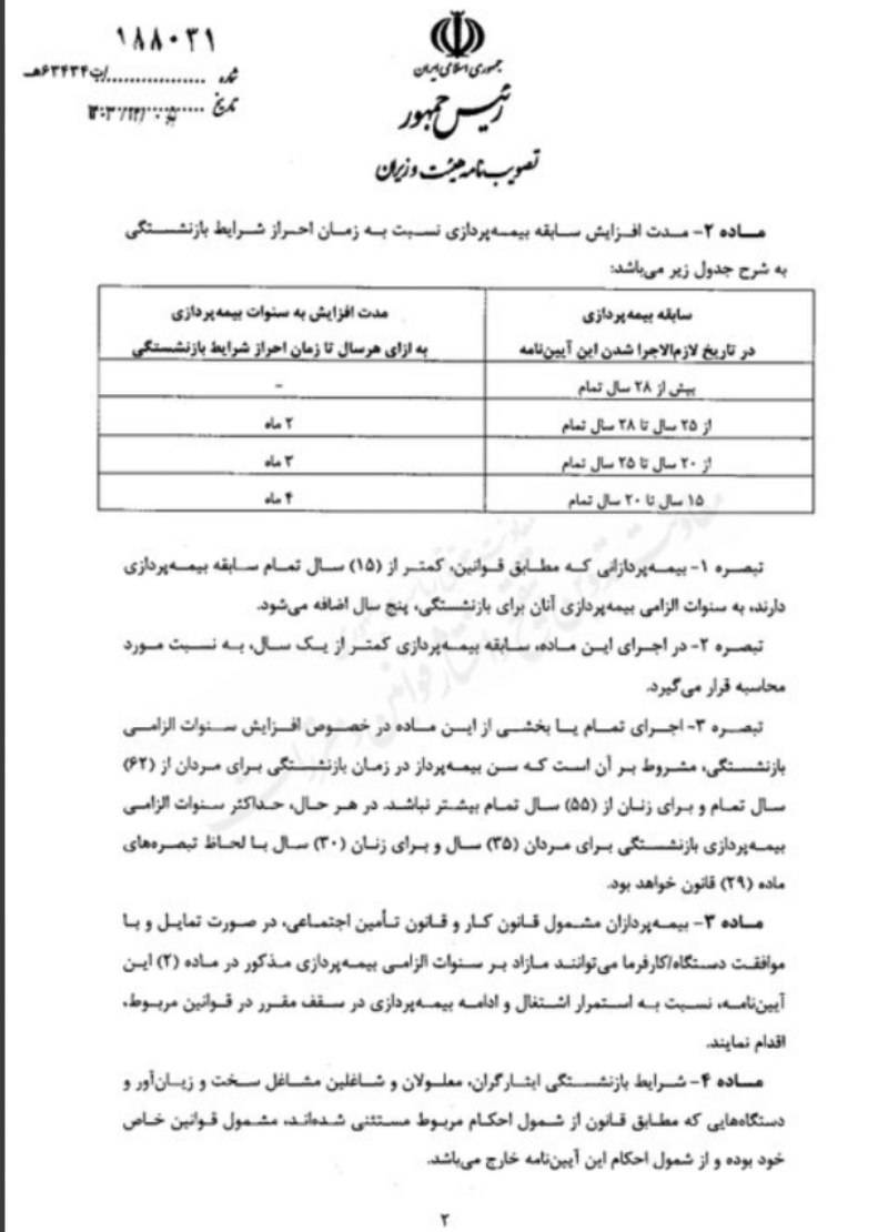 در اجرای تمام یا بخشی از این قانون در خصوص افزایش سنوات الزامی بازنشستگی مشروط بر آن است که سن بیمه پرداز در زمان بازنشستگی برای مردان از ۶۲ سال تمان و برای زنان از ۵۵ سال تمام بیشتر نباشد. در هر حال حداکثر سنوات الزامی بیمه پردازی بازنشستگی برای مردان (۳۵) سال و برای زنان (۳۰) سال با لحاظ تبصره های ماده (۲۹) قانون خواهد بود.