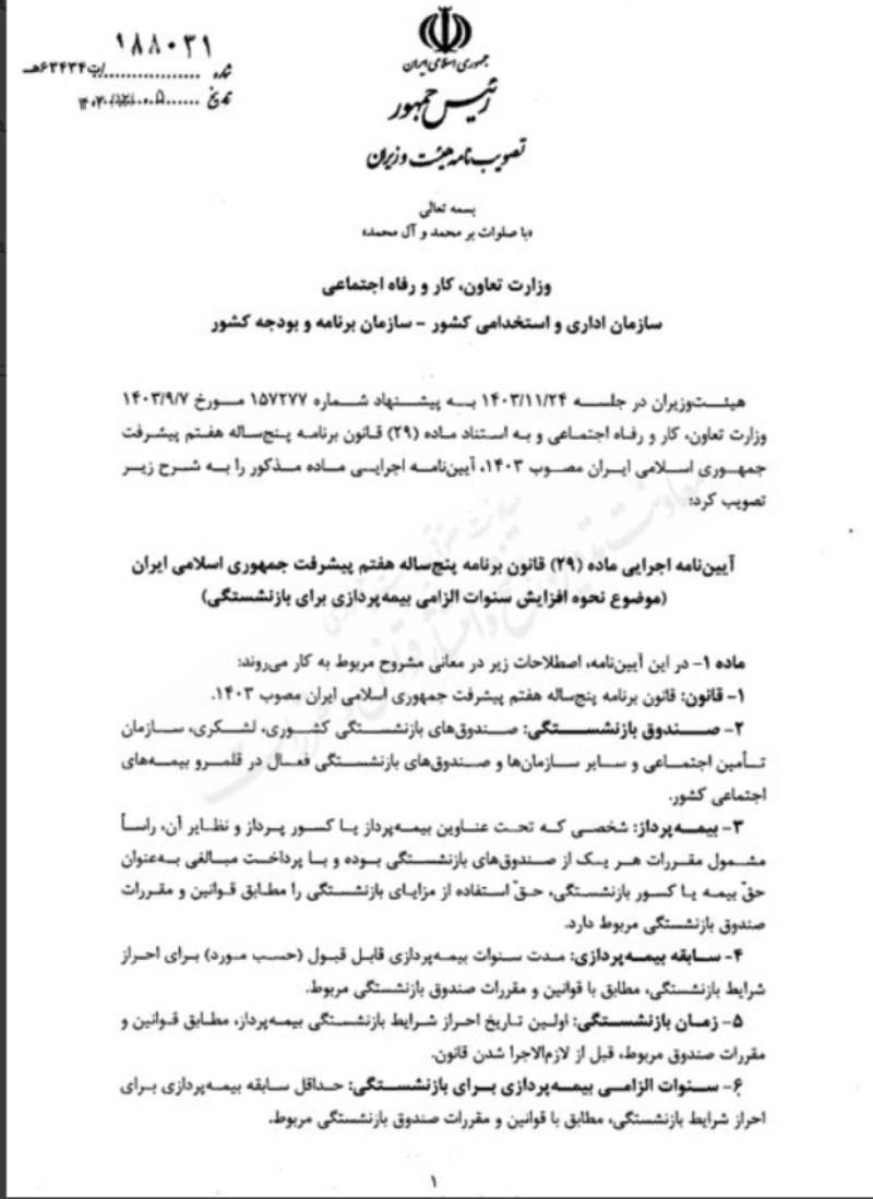 هیات وزیران در جلسه ۲۴ بهمن ۱۴۰۳ به پیشنهاد شماره ۱۵۷۲۷۷ مورخ ۷ آذر ۱۴۰۳ وزارت تعاون، کار و رفاه اجتماعی و به استناد ماده (۲۹) قانون برنامه پنج ساله هفتم پیشرفت جمهوری اسلامی ایران مصوب ۱۴۰۳، آیین نامه اجرایی ماه مذکور را تصویب کرده بود.