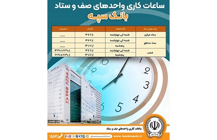 براساس اعلام شورای هماهنگی بانکها ساعت کاری بانک سپه از اول اسفند ماه سال جاری لغایت ۱۵ فروردین ماه ۱۴۰۴ اعلام شد.