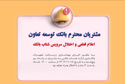 سرویس شتاب بانک توسعه تعاون با قطعی و اختلال موقت همراه خواهد بود.