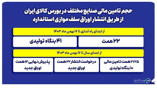 طبق گفته سونیا یاسی رئیس اداره اوراق تامین مالی بورس کالای ایران، از ابتدای سال ۱۴۰۳ تاکنون بیش از ۴۴ درخواست انتشار اوراق، برای تامین مالی بنگاههای تولیدی متوسط و بزرگ در سطح کشور مطرح شده که رقم آن بالغ بر ۲۲ همت است و برآورد میشود این مقدار تا انتهای سال جاری افزایش یابد. براساس آمار اعلامی، از این تعداد ۲۵ شرکت از بخش صنعت و معدن، ۱۳ شرکت بخش پتروشیمی و ۶ شرکت بخش کشاورزی بودهاند که حدود ۱۲ همت از آنها پذیرش نهایی را دریافت کرده و مابقی اوراق نیز تا پایان سال جاری پذیرش خواهند شد. همچنین، از ابتدای سال تاکنون بالغ بر ۲ همت از کل اوراق پذیرش شده منتشر شده است که پیشبینی میشود تا پایان سال جاری این مبلغ به حدود ۱۰ همت افزایش یابد.