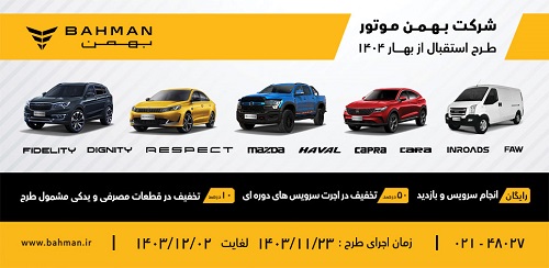 طرح استقبال از بهار ۱۴۰۴ بهمن موتور، فرصت خوبی برای مالکان خودروهای این شرکت است تا با هزینهای کمتر، خودروهای خود را سرویس کنند و از مزایای تخفیفهای ارائهشده بهرهمند شوند. اجرای این طرح نشاندهنده تعهد بهمن موتور به مشتریان خود و تلاش برای بهبود خدمات پس از فروش است. اگر خودروی شما یکی از مدلهای مشمول این طرح است، پیشنهاد میشود که در این بازه زمانی از این فرصت استفاده کنید و خودرویتان را برای ورود به سال جدید آماده کنید.