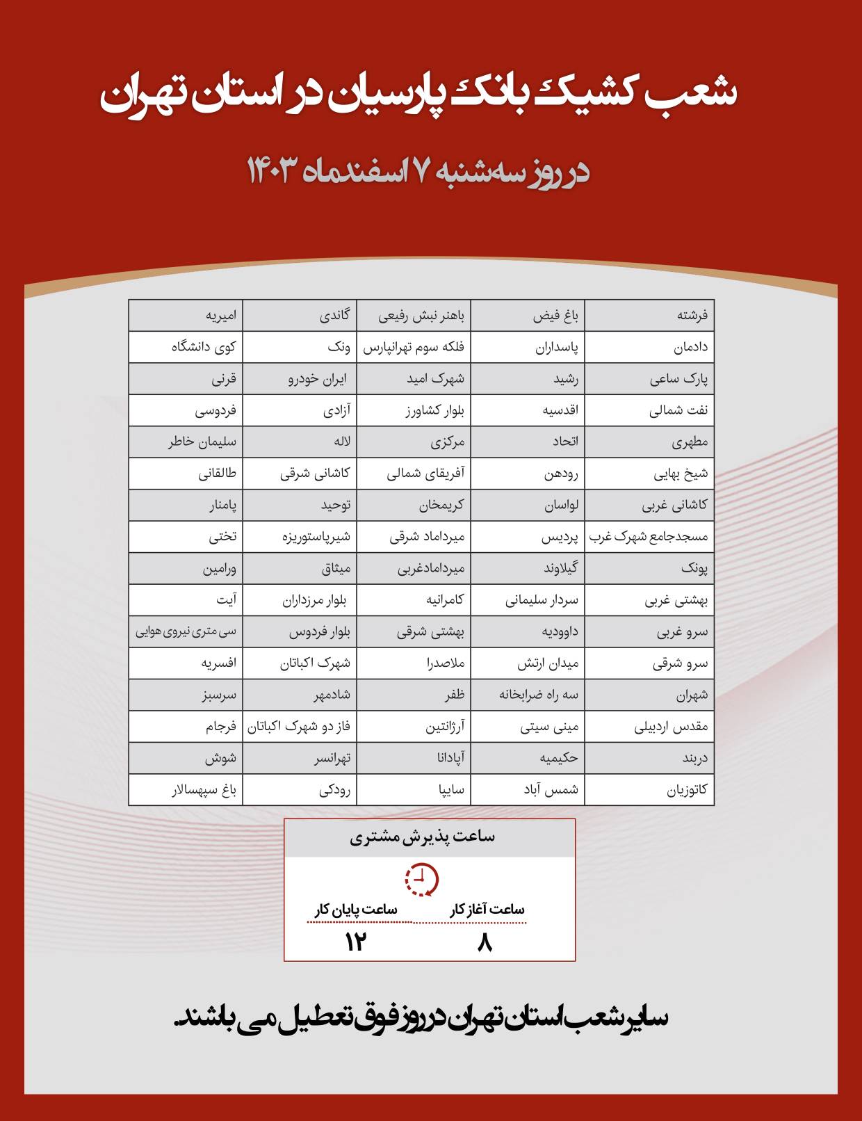 بانک پارسیان پیرو اعلام تعطیلی روز سه شنبه ۷ اسفندماه استان تهران، ساعت کاری وشعب کشیک این بانک را برای ارایه خدمت به مشتریان اعلام کرد. به گزارش فراسو، اسامی شعب اعلام شده و ساعت کاری آنها بدین شرح است: