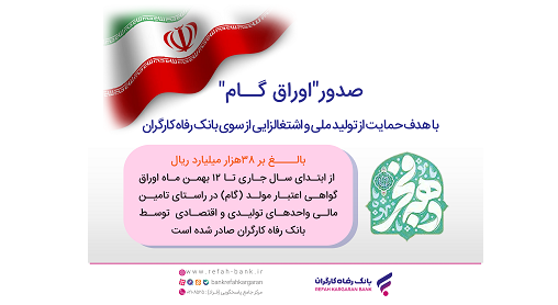 بانک رفاه کارگران از ابتدای سال جاری تا ۱۲ بهمن ماه بالغ بر ۳۸ هزار میلیارد ریال اوراق گواهی اعتبار مولد (گام) در راستای تامین مالی واحدهای تولیدی و اقتصادی صادر کرده است.