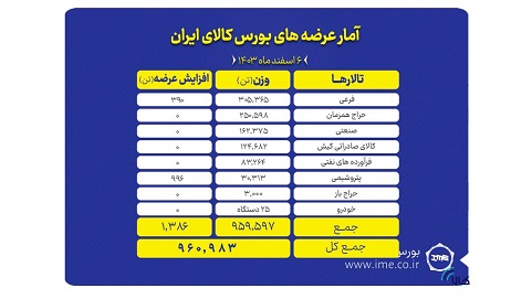 تالارهای بورس کالای ایران روز دوشنبه ۶ اسفند میزبان عرضه ۹۶۰ هزار و ۹۸۳ تن انواع کالا و محصول است.