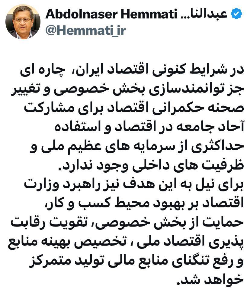 به گزارش فراسو به نقل از شادا، دکتر عبدالناصر همتی وزیر امور اقتصادی و دارایی در شبکه اجتماعی ایکس نوشت: در شرایط کنونی اقتصاد ایران، چاره ای جز توانمندسازی بخش خصوصی و تغییر صحنه حکمرانی اقتصاد برای مشارکت آحاد جامعه در اقتصاد و استفاده حداکثری از سرمایه های عظیم ملی و ظرفیت های داخلی وجود ندارد.