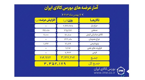 تالارهای بورس کالای ایران در روز سهشنبه ۱۶ بهمن ماه میزبان عرضه ۳ میلیون و ۳۵۲ هزار و ۱۷۸ تن انواع کالا و محصول است.