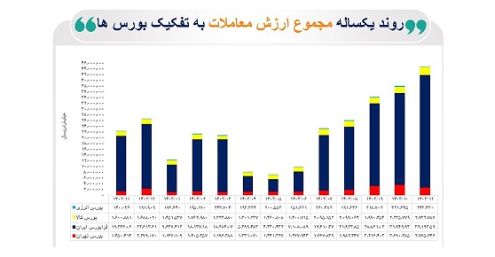 به گزارش فراسو، مجموع ارزش معاملات بورسها در ۱۱ ماه امسال (از ابتدای فروردین تا پایان بهمن) با ۲۲ درصد افزایش به ۲۵ هزار همت رسید. ارزش معاملات بورسها در مدت مشابه سال گذشته ۱۸ هزار همت بود.