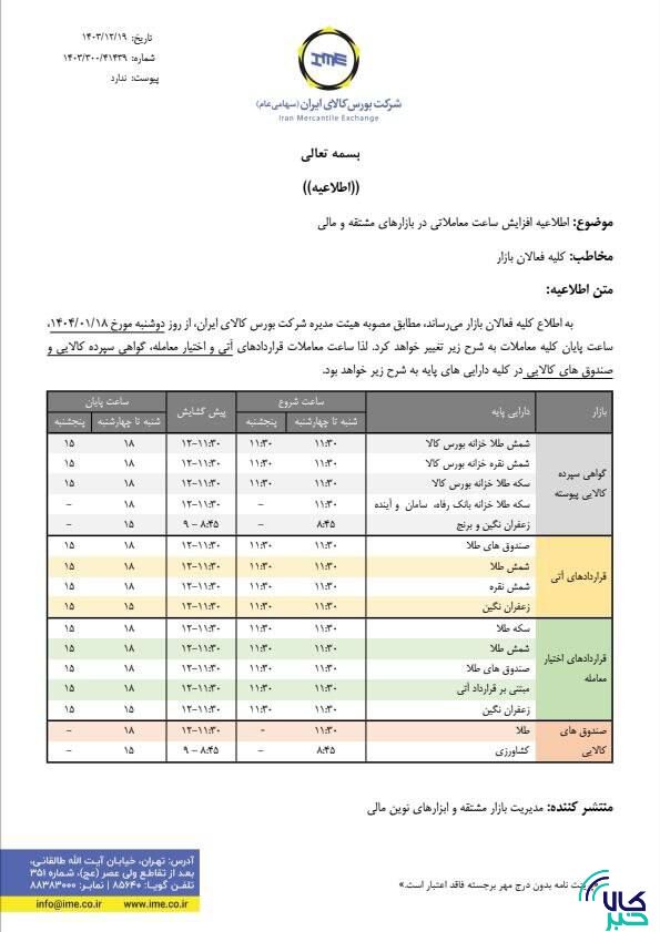 بورس کالای ایران در تاریخ ۱۹ اسفندماه ۱۴۰۳ در اطلاعیه ای مهم برای فعالان بازارهای مالی اعلام کرد که از روز دوشنبه ۱۸ فروردین ۱۴۰۴، ساعت معاملاتی در بازارهای مشتقه و مالی این بورس افزایش می یابد. در این میان افزایش ۳ ساعته معاملات صندوق های طلا بسیار حائز اهمیت بود که محقق شد و به این ترتیب از ۱۸ فروردین ماه جاری، ساعت معاملات صندوق های طلا از ۱۱:۳۰ تا ۱۸ است.