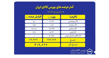 تالارهای بورس کالای ایران در نخستین روز هفته (شنبه ۱۸ اسفندماه) میزبان عرضه ۳۰۹ هزار و ۶۲۶ تن انواع کالا و محصول است.
