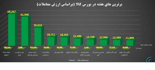 فولاد مبارکه اصفهان با معامله ۱۸۵هزار و ۷۴۰ تن تختال و انواع ورق به ارزش ۶هزار و ۸۲۶ میلیارد تومان در رتبه نخست ایستاد.