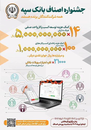 بانک سپه در راستای ارائه خدمات ویژه به مشتریان صنفی خود، نخستین جشنواره بزرگ اصناف را در بازه زمانی ۲۲ بهمنماه ۱۴۰۳ تا ۳۱ خردادماه ۱۴۰۴ برگزار میکند.