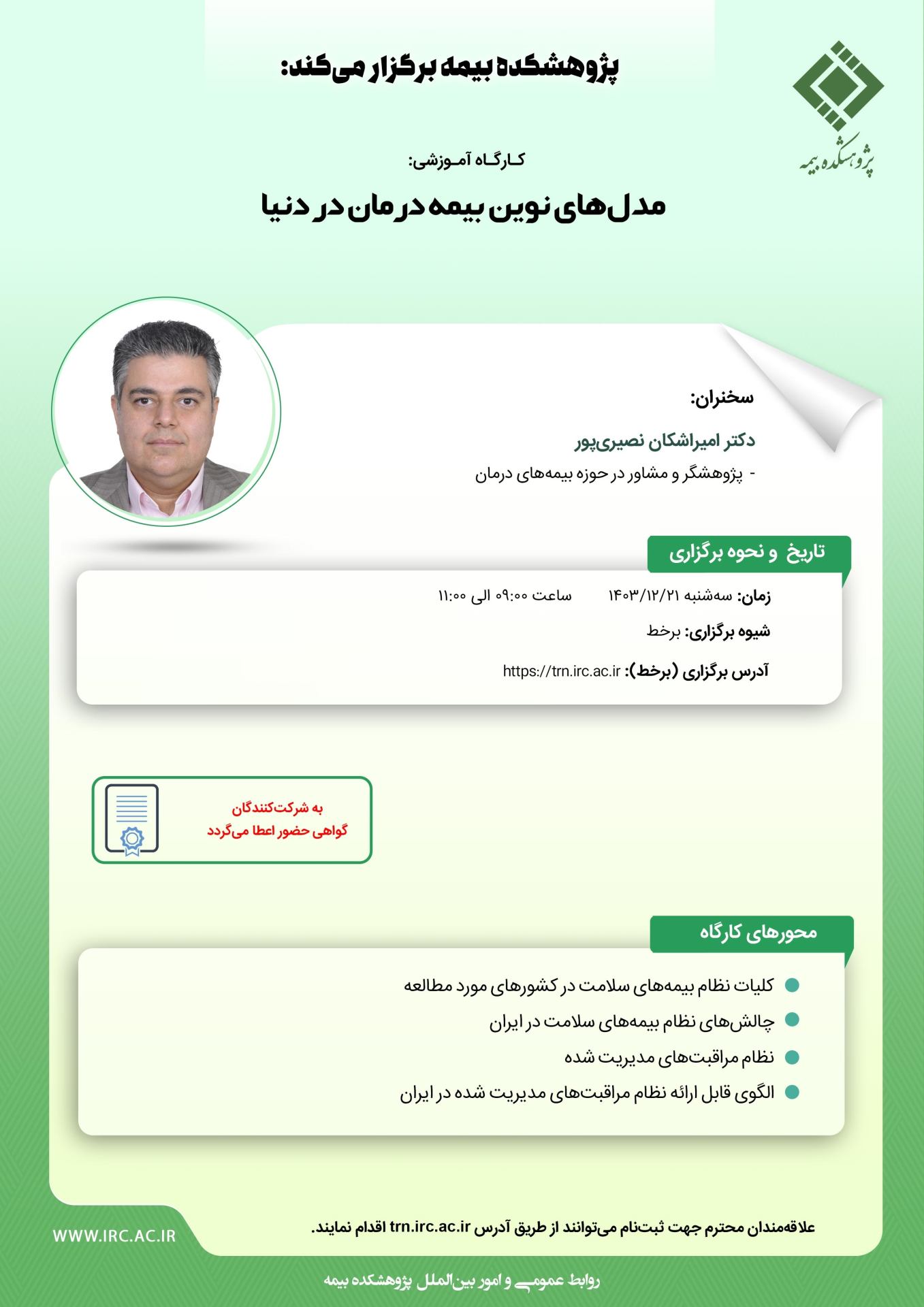 کارگاه آموزشی «مدلهای نوین بیمه درمان در دنیا» از ساعت ۹:۰۰ تا ۱۱:۰۰ روز سهشنبه ۲۱ اسفند ۱۴۰۳ به صورت برخط از طریق سامانه مدیریت یادگیری پژوهشکده بیمه برگزار میشود.