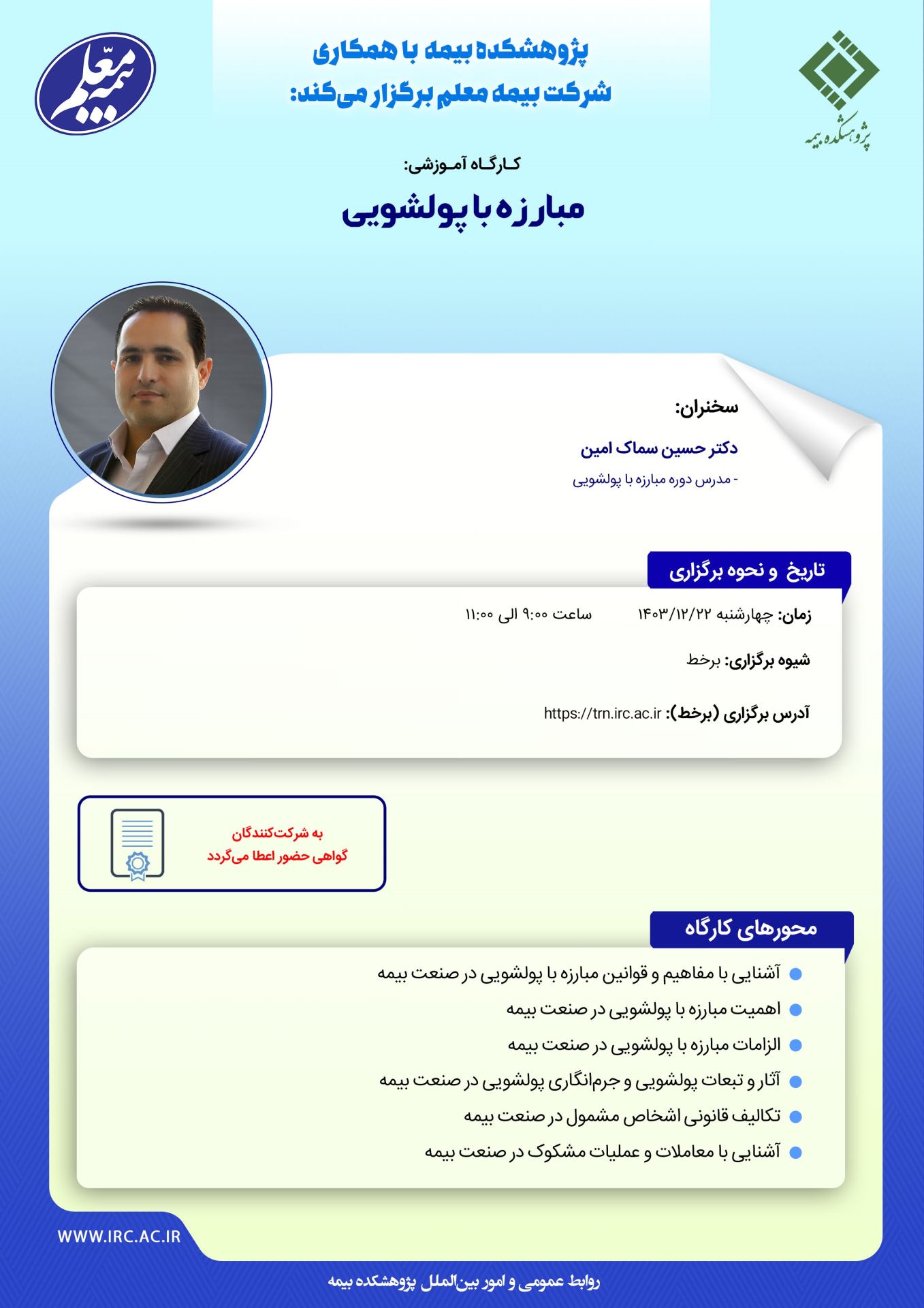 به گزارش فراسو به نقل از روابط عمومی و امور بینالملل پژوهشکده بیمه، در این کارگاه آموزشی که با همکاری شرکت بیمه معلم در این پژوهشکده برگزار خواهد شد، محورهای «آشنایی با مفاهیم و قوانین مبارزه با پولشویی در صنعت بیمه»، «اهمیت مبارزه با پولشویی در صنعت بیمه»، «الزامات مبارزه با پولشویی در صنعت بیمه»، «آثار و تبعات پولشویی و جرمانگاری پولشویی در صنعت بیمه»، «تکالیف قانونی اشخاص مشمول در صنعت بیمه» و «آشنایی با معاملات و عملیات مشکوک در صنعت بیمه» توسط آقای دکتر حسین سماک امین، مدرس دوره مبارزه با پولشویی ارائه خواهد شد.