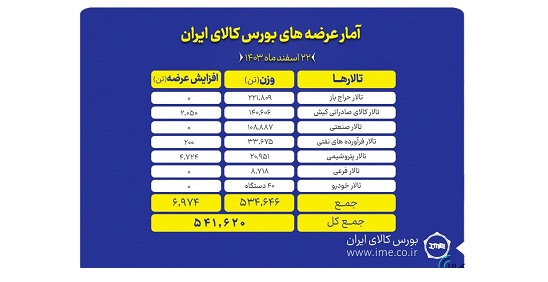 تالارهای بورس کالای ایران (چهارشنبه ۲۲ اسفندماه) میزبان عرضه ۵۴۱ هزار و ۶۲۰ تن انواع کالا و محصول است.