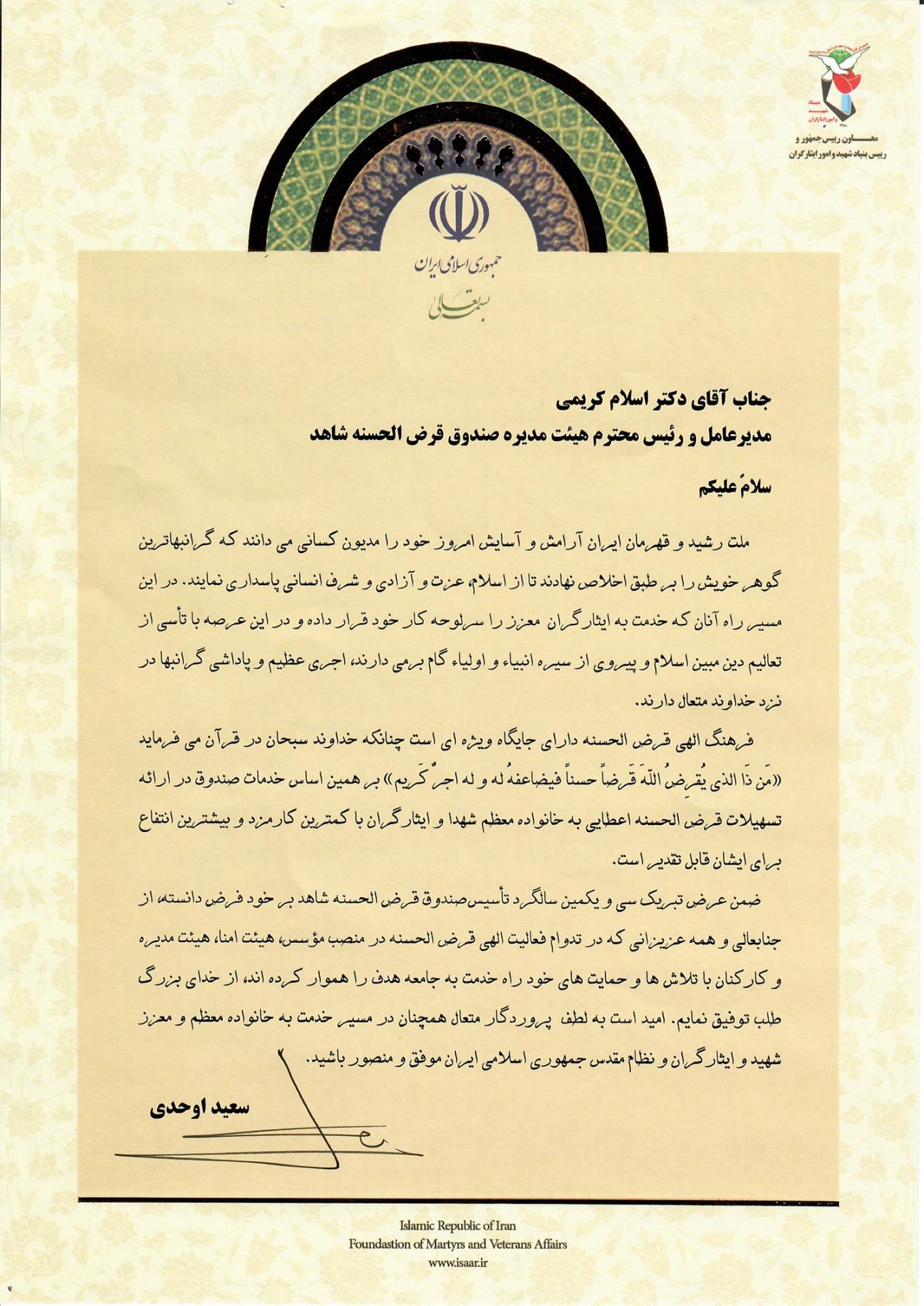 مهندس اوحدی معاون رئیس جمهور و رییس بنیاد شهید و امور ایثارگران با صدور پیامی از دکتر اسلام کریمی مدیرعامل و رئیس هیئت مدیره صندوق قرض الحسنه شاهد تقدیر کرد.