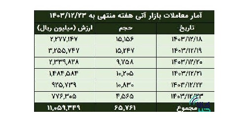 بررسی روند معاملات بازار قراردادهای آتی بورس کالای ایران درهفته منتهی به ۲۳ اسفند ماه نشان می دهد که در هفته گذشته بیش از ۶۵ هزار قرارداد منعقد شد و ارزش این معاملات به بیش از ۱.۱ همت رسید.