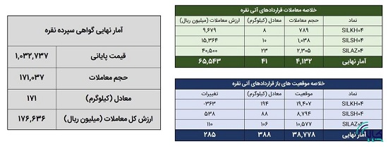 در روز ۲۷ اسفندماه در مجموع ۲۱۲ کیلوگرم شمش نقره در بورس کالای ایران معامله شد.