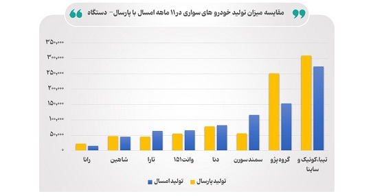 آمار ها نشان میدهد: در ۱۱ ماه امسال تولید خودروهای سورن، تارا، خانواده چانگان و تا حدودی دنا افزایش یافته است اما تولید خورد های شاهین، رانا و خانواده پژو و در عین حال محصولات ایکس ۲۰۰ شامل کوییک تیبا و ساینا کاهش یافته است.