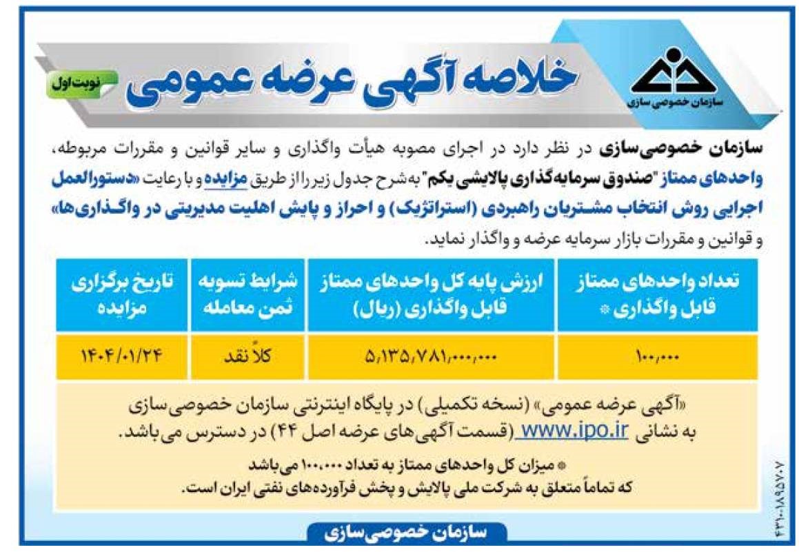 سازمان خصوصیسازی در نظر دارد در اجرای مصوبه هیأت واگذاری و سایر قوانین و مقررات مربوطه، واحدهای ممتاز “صندوق سرمایهگذاری پالایشی یکم” را از طریق مزایده عرضه و واگذار نماید.