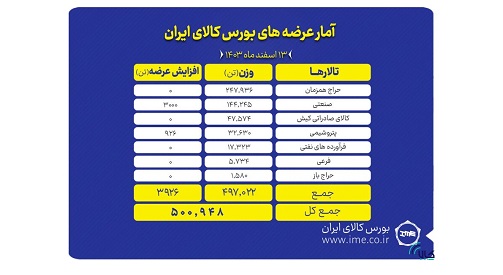 تالارهای بورس کالای ایران روز دوشنبه ۱۳ اسفند میزبان عرضه ۵۰۰ هزار و ۹۴۸ تن انواع کالا و محصول است.