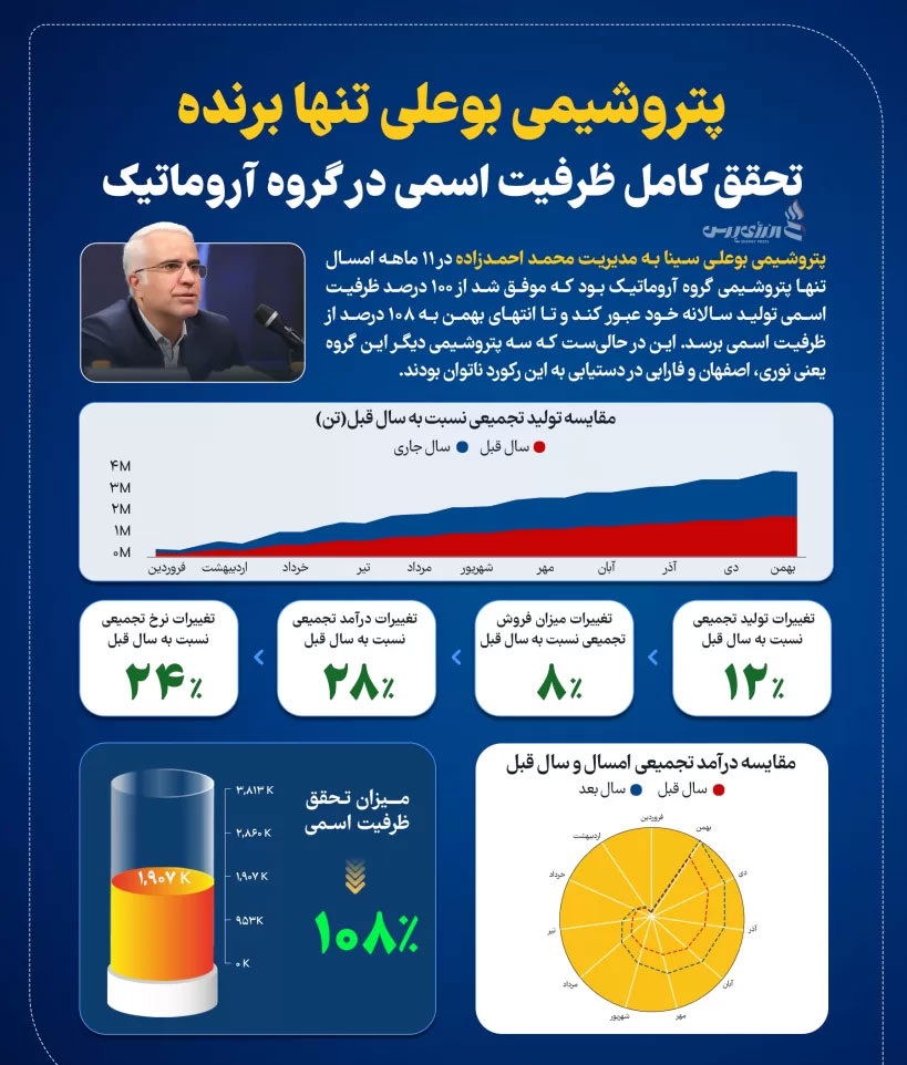 به گزارش فراسو، نگاهی به عملکرد ۱۱ ماهه این شرکت نشان میدهد که میزان تولید، فروش و درآمد پتروشیمی بوعلی سینا نسبت به سال گذشته افزایش قابلتوجهی داشته و ۱۰۸ درصد از ظرفیت اسمی تولید سالانه این پتروشیمی تا انتهای بهمن محقق شده است.