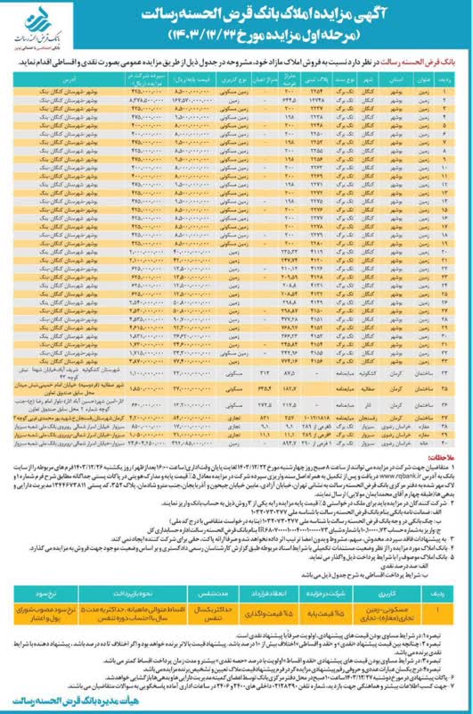 بانک قرض الحسنه رسالت در نظر دارد نسبت به فروش املاک مازاد خود، مشروحه در جدول فوق از طریق مزایده عمومی بصورت نقدی و اقساطی اقدام نماید.