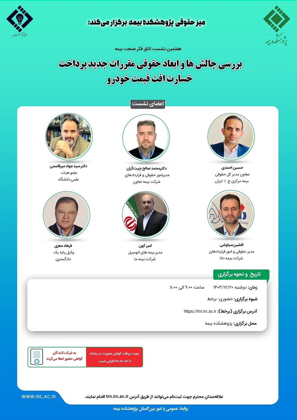 به گزارش فراسو به نقل از روابط عمومی و امور بینالملل پژوهشکده بیمه، در این نشست، دکتر محمد صالح چیتگران، مدیر امور حقوقی و قراردادهای شرکت بیمه تعاون، دکتر سیدجواد میرقاسمی، عضو هیات علمی دانشگاه آزاد اسلامی، حسین احمدی، معاون مدیرکل حقوقی بیمه مرکزی ج. ا. ایران، افشین سیاوشی، مدیر حقوقی و امور قراردادهای شرکت بیمه دانا، امیر کهن، مدیر بیمه های اتومبیل شرکت بیمه ما و فرهاد معزی، وکیل پایه یک دادگستری به بحت و بررسی در خصوص ابعاد حقوقی مقررات جدید پرداخت خسارت افت قیمت خودرو و چالش¬های پیش رو خواهند پرداخت.