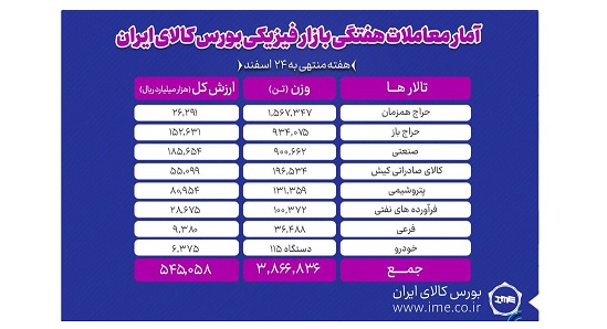 در معاملات هفته گذشته بازار فیزیکی بورس کالای ایران ۳ میلیون و ۸۶۶ هزار و ۸۳۶ تن انواع محصول به ارزش ۵۴ هزار میلیارد تومان دادوستد شد.