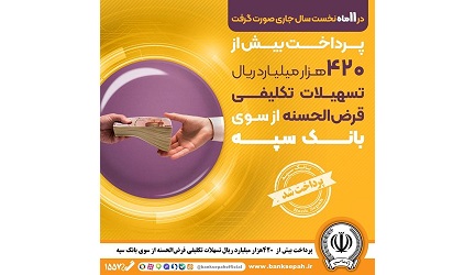 بانک سپه از ابتدای سال ۱۴۰۳ تا انتهای بهمن ماه این سال بیش از ۴۲۰ هزار میلیارد ریال تسهیلات تکلیفی قرضالحسنه پرداخت کرده است.