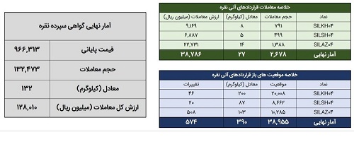 به گزارش فراسو، خلاصه معاملات بازار نقره در روز ۲۵ اسفندماه نشان می دهد که در این روز ۱۳۲ هزار و ۴۷۳ گواهی معادل ۱۳۲ کیلوگرم شمش نقره به ارزش حدود ۱۳ میلیارد تومان در بازار گواهی سپرده دادوستد شد.