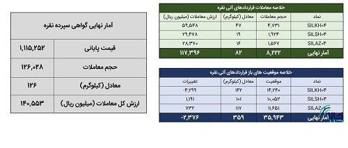 به گزارش فراسو،خلاصه معاملات بازار نقره در روز ۵ فروردین ماه نشان می دهد که در این روز ۱۲۶هزار گواهی معادل ۱۲۶ کیلوگرم شمش نقره به ارزش ۱۴ میلیارد تومان در بازار گواهی سپرده دادوستد شد.