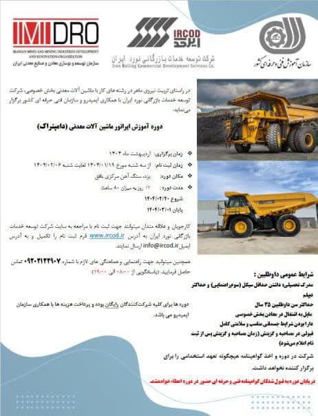 ثبت نام دوره جدید آموزش رایگان کارور ماشینآلات معدنی (اپراتور دامپتراک) از سوی شرکت توسعه خدمات بازرگانی نورد ایران (وابسته به ایمیدرو) آغاز شد.