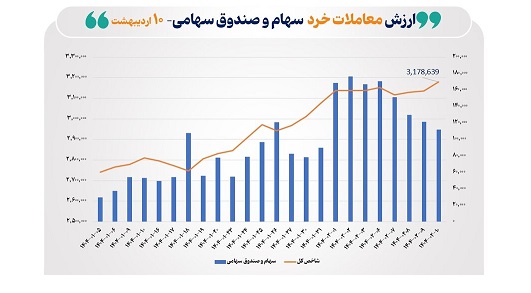 دادههای آماری مدیریت نظارت بر بورسهای سازمان بورس حاکی از آن است که در معاملات امروز بازار سهام، ارزش معاملات خرد، شامل: «مبادلات سهام و صندوقهای سهامی»، به مرز ۱۲ همت رسید.