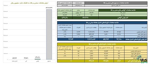 در قراردادهای اختیار معامله مبتنی بر طلا ۹۳ هزار قرارداد به ارزش ۵ میلیارد تومان دادوستد شد. همچنین یک هزار و ۲۰۶ قراردادآتی مبتنی بر طلا به ارزش ۱۹ میلیارد تومان منعقد شد./کالاخبر
