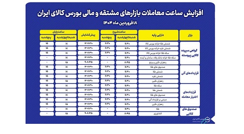 بنابراین گزارش، طبق اطلاعیه مدیریت بازار مشتقه و ابزارهای نوین مالی بورس کالای ایران، ساعت معاملاتی چهار بازار گواهی سپرده کالایی پیوسته، قراردادهای آتی، قراردادهای اختیار معامله و صندوق های کالایی از روز ۱۸ فروردین ماه، طبق جدول افزایش می یابد.