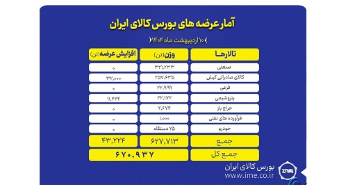 تالارهای بورس کالای ایران امروز چهارشنبه ۱۰ اردیبهشت ماه میزبان عرضه ۶۷۰ هزار و ۹۳۷ تن انواع محصول است.